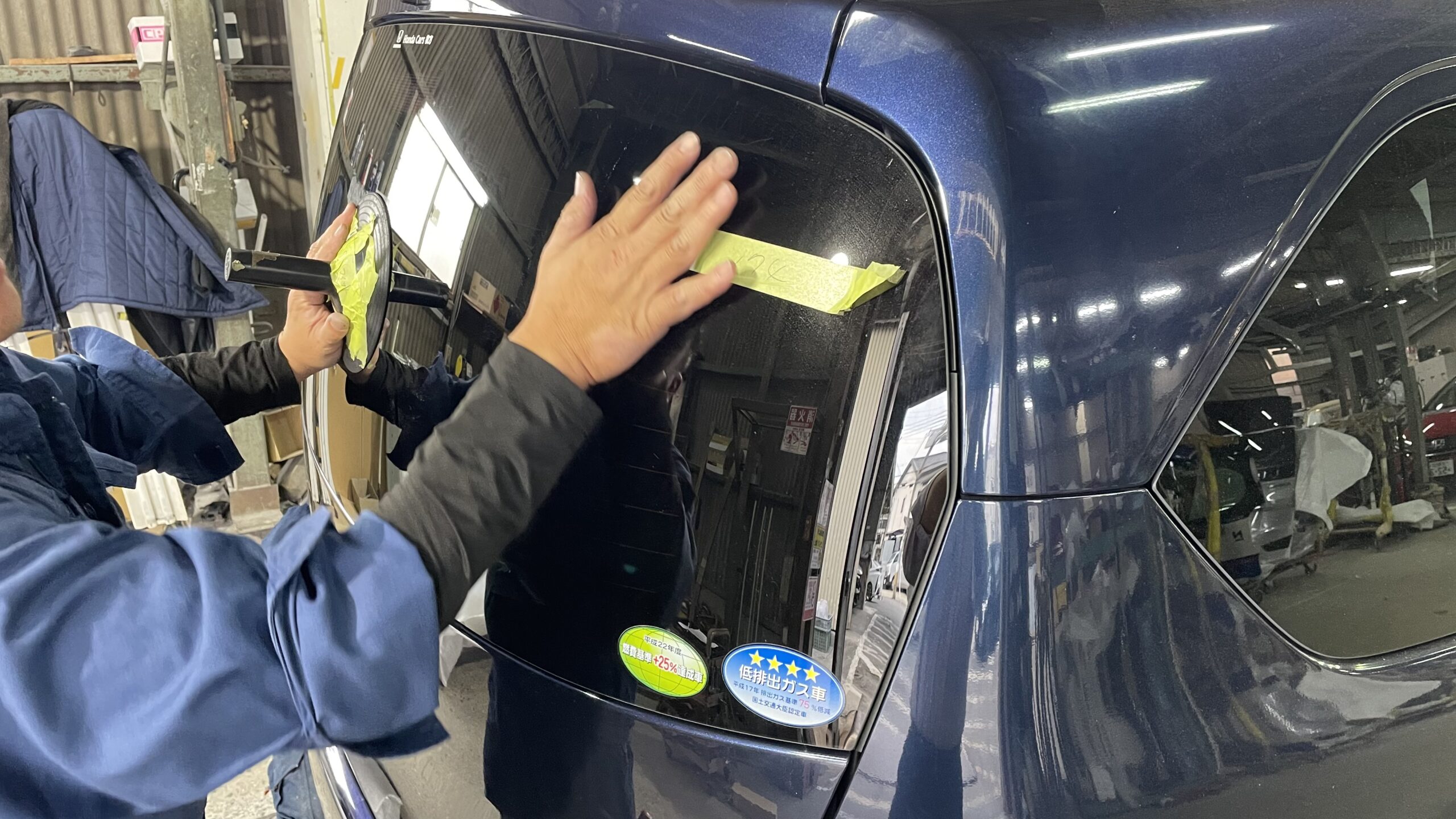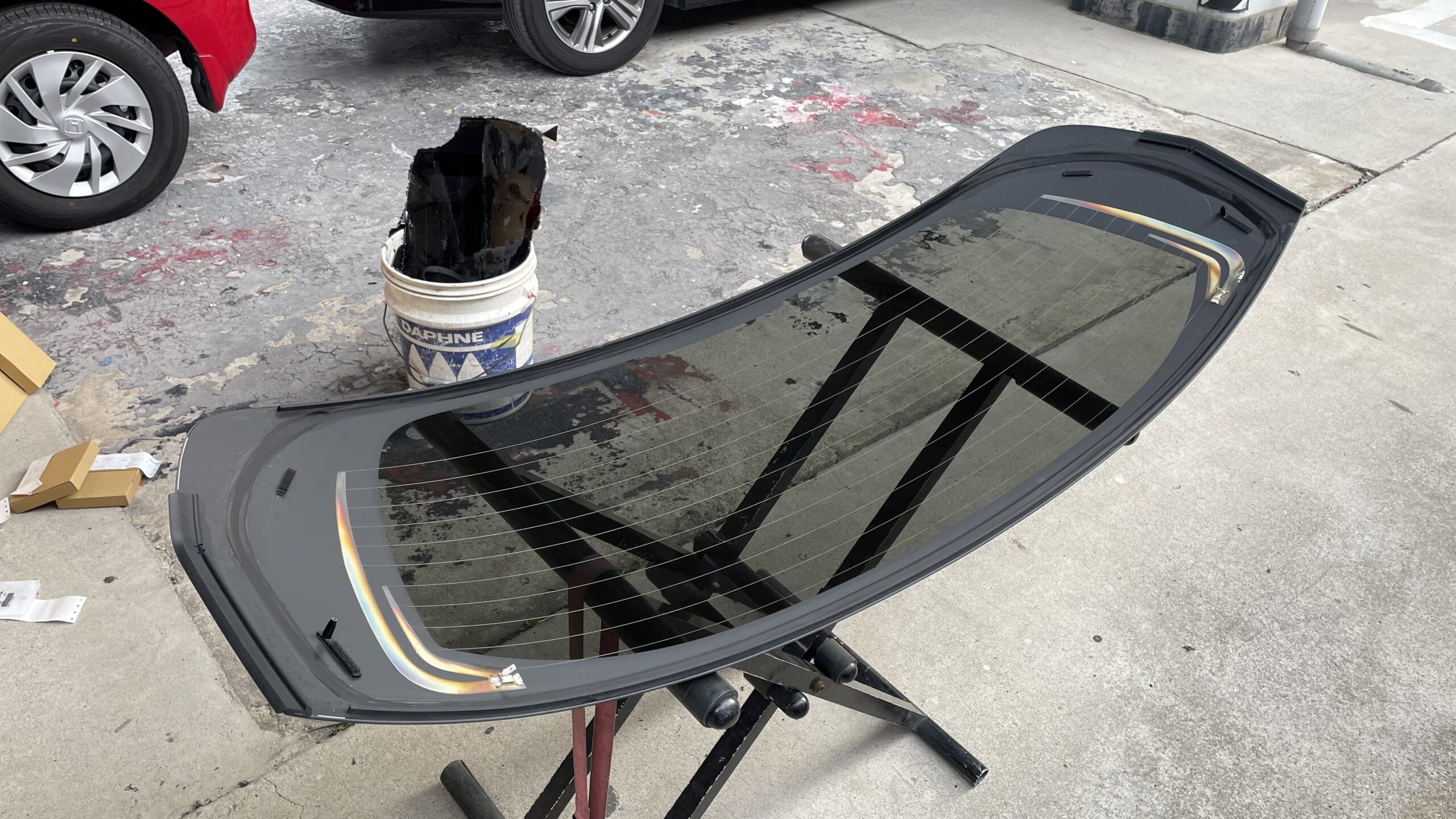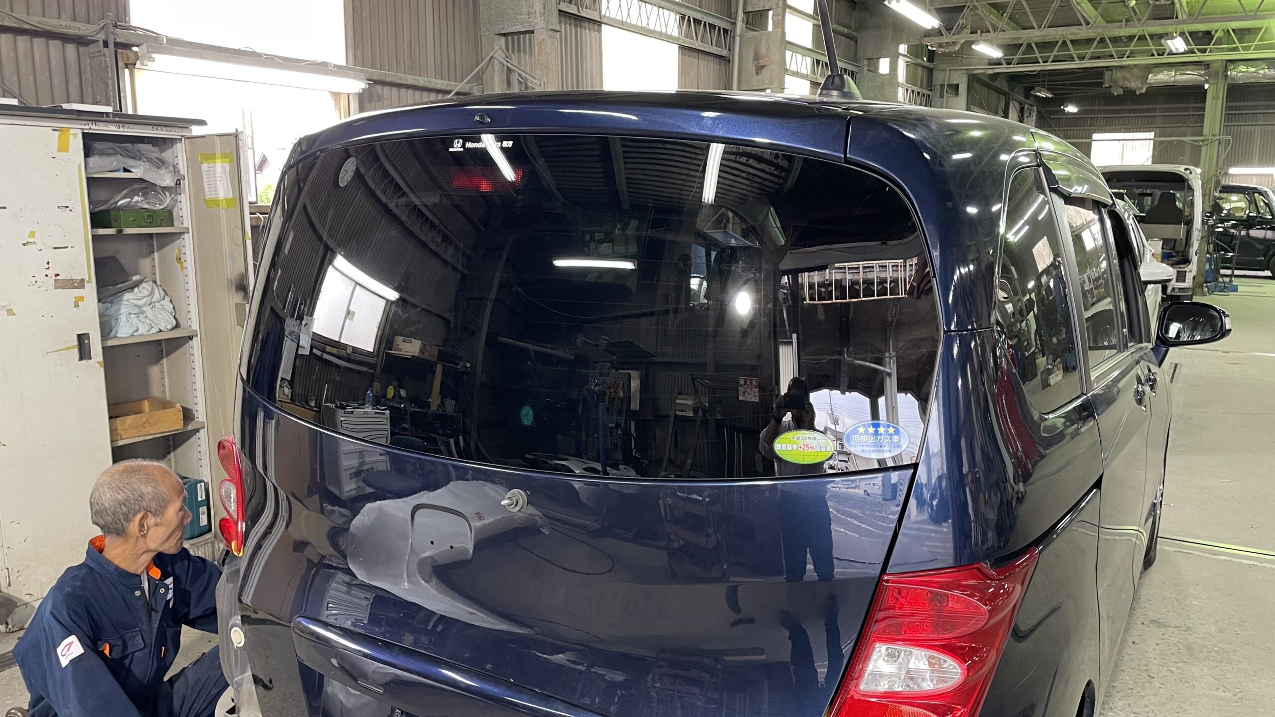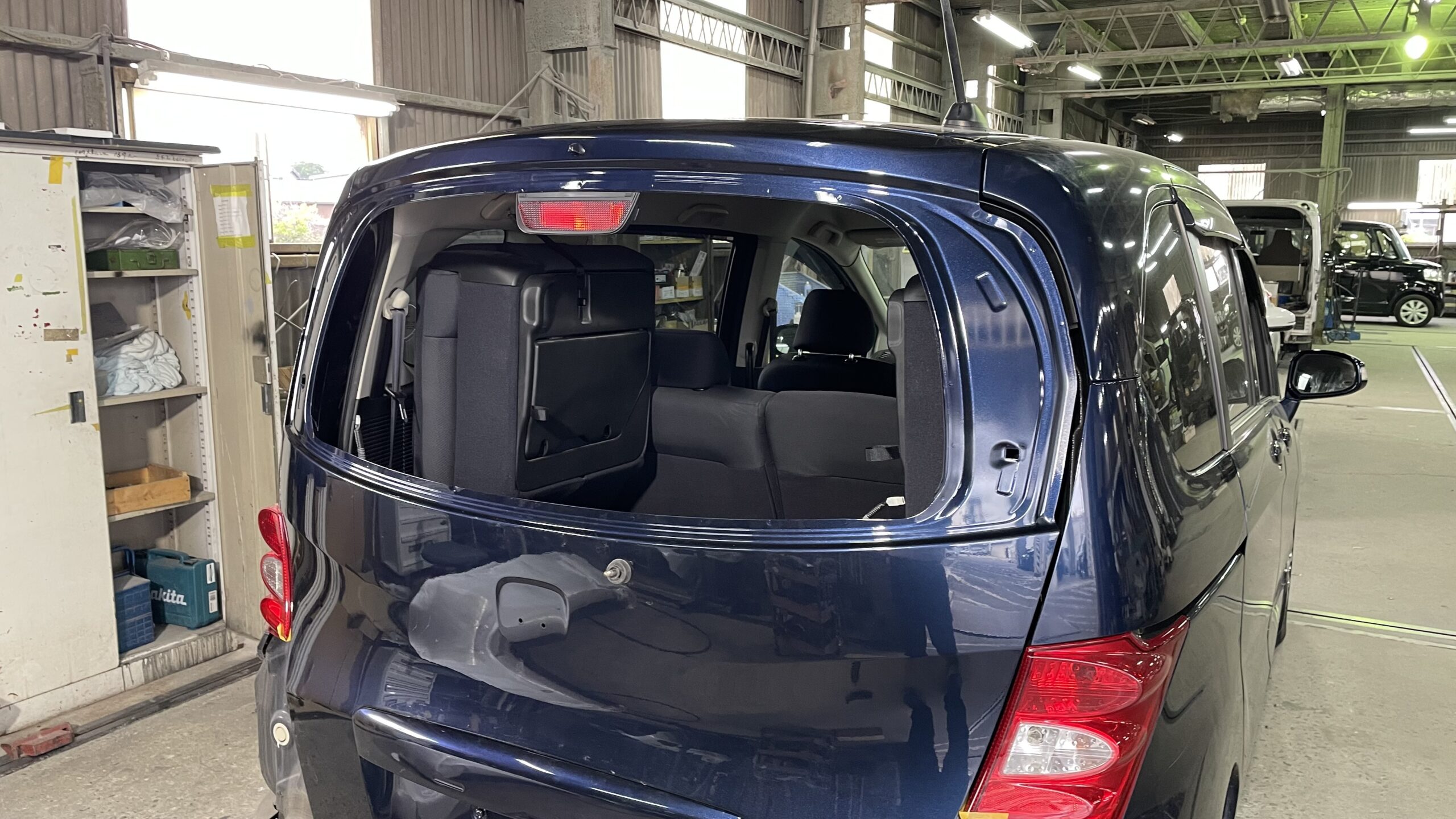 リアガラス脱着 フリードのリアガラス脱着作業。 ガラスを外して鈑金や、塗装作業を行います
