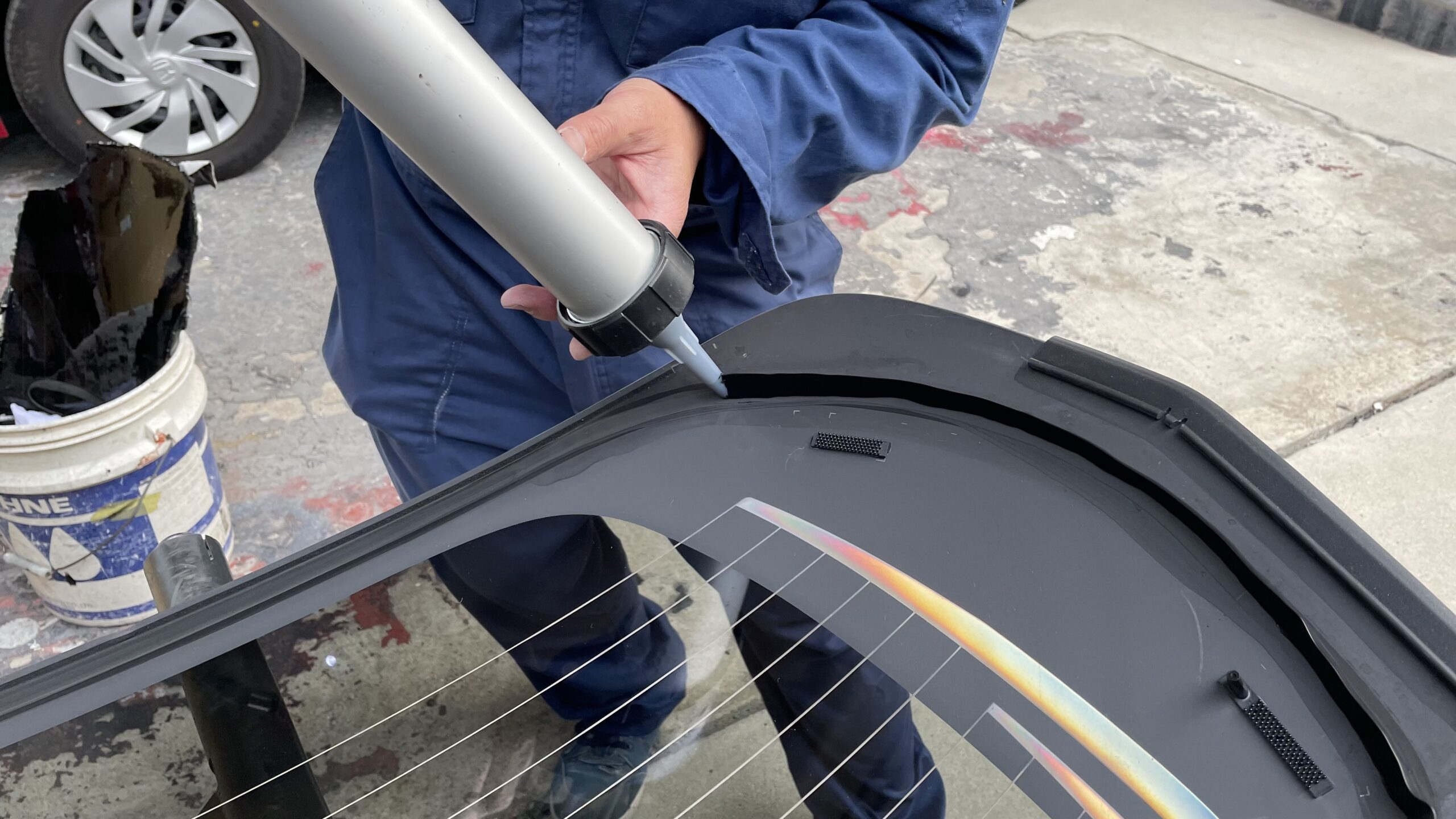 接着剤を着けるのですが、これを適当にすると雨漏れの原因になります。 接着剤がガラスとしっかり着くようにプライマーを塗ってから接着剤をつけますが、この時の形状がポイント、プロの腕が見れました