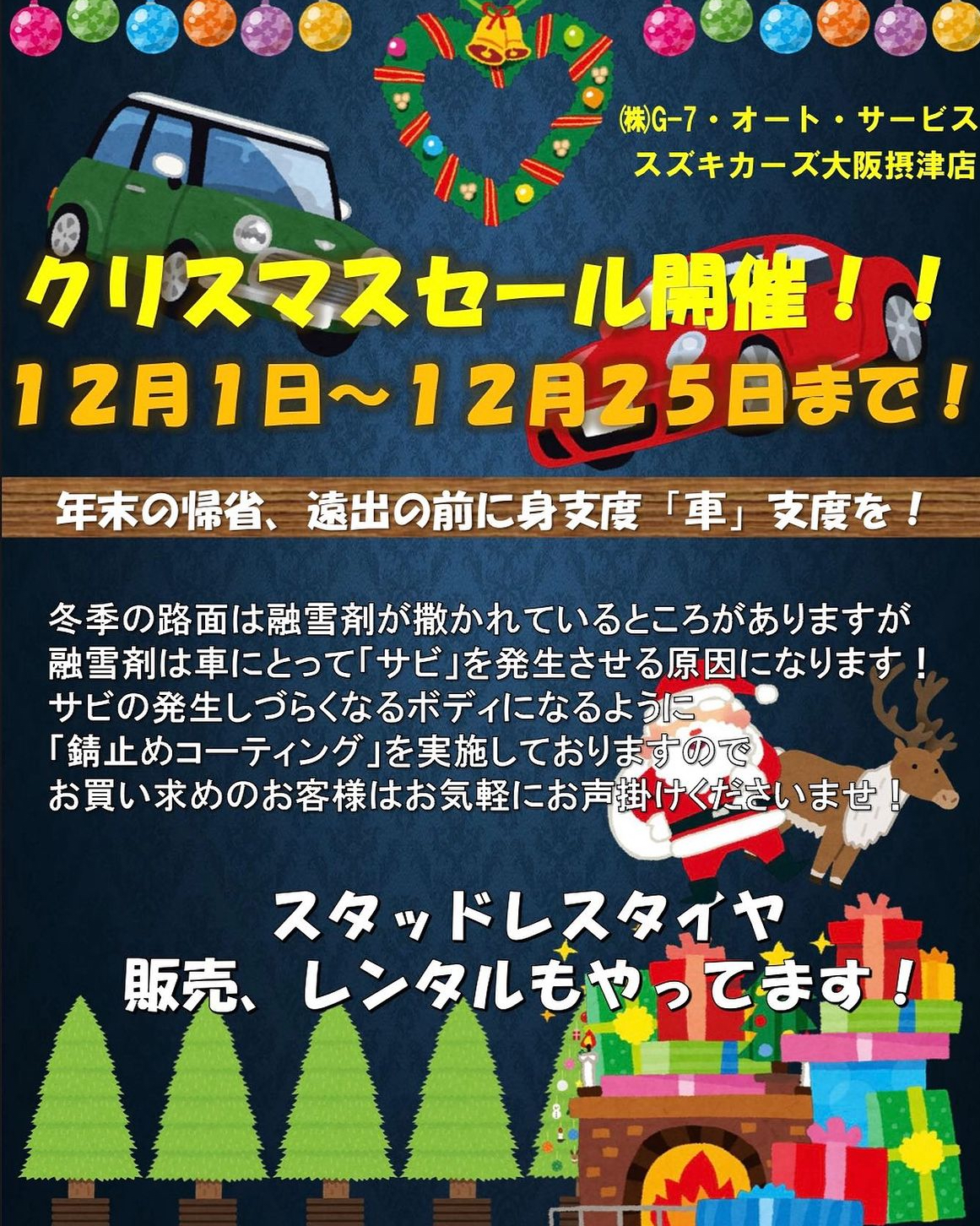 12月1日よりクリスマスセールを開催します! 普段から来店して頂いてるお客様も最近行ってないな〜というお客様もこの機会にぜひ一度ご来店ください! また、引き続きスタッドレスタイヤのレンタルも随時受付中ですのでよろしくお願いします!